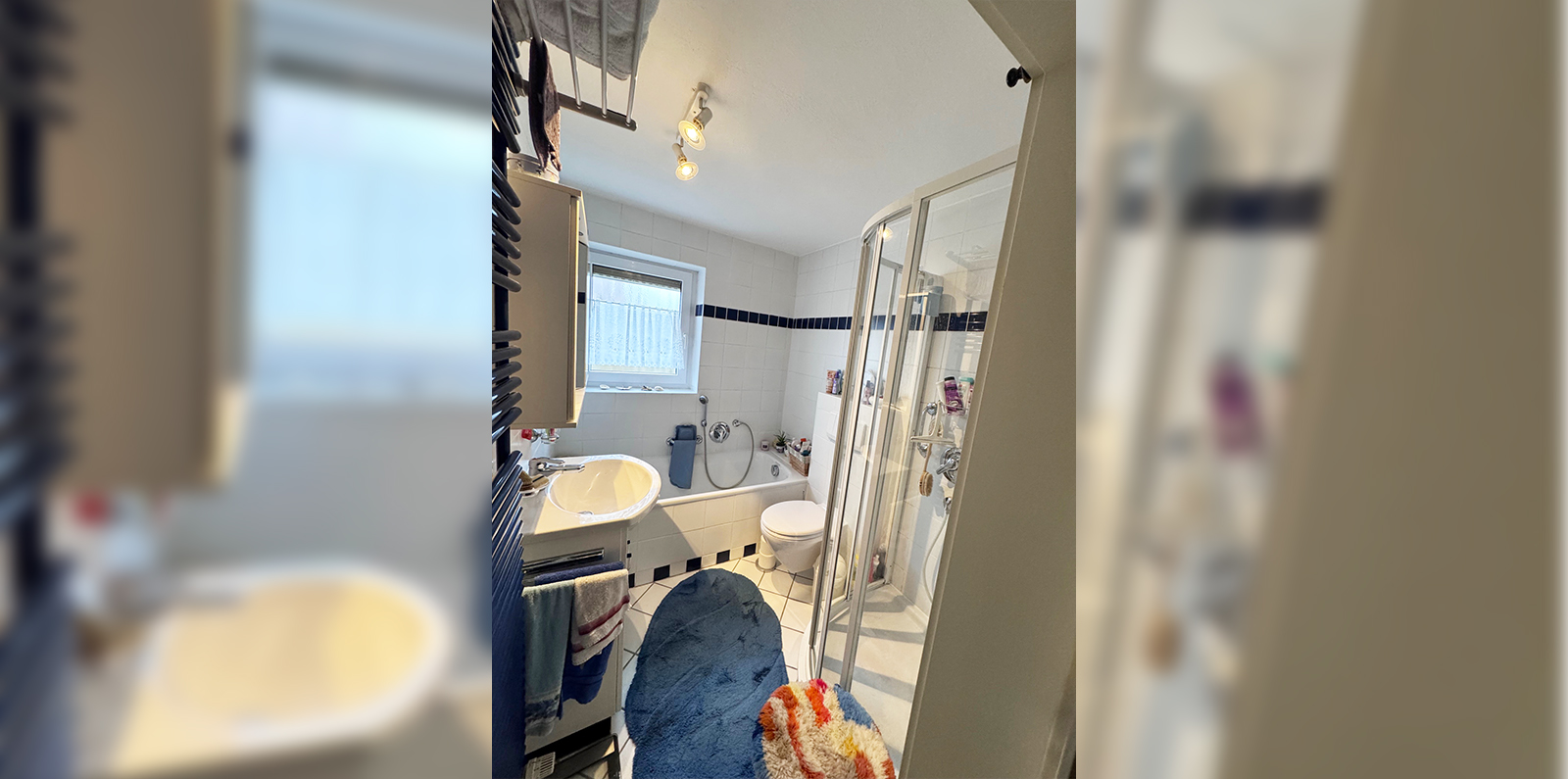 • Hauptbad mit Dusche, Badewanne, Handtuchheizkörper und Gästebad + Gäste WC